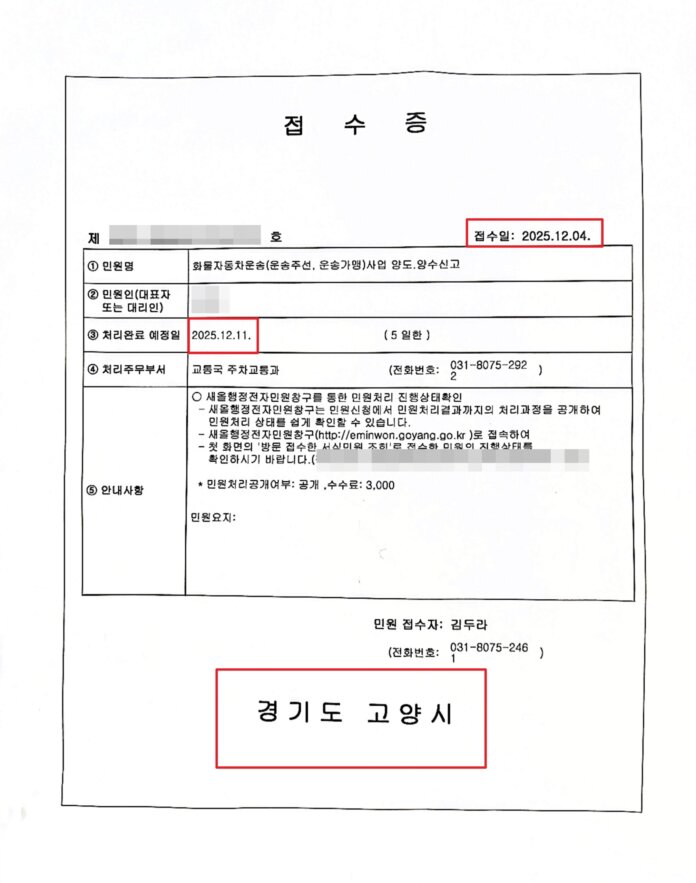 🚚 경기도 고양시 — 1톤 윙바디 신차 용달번호판 계약 진행